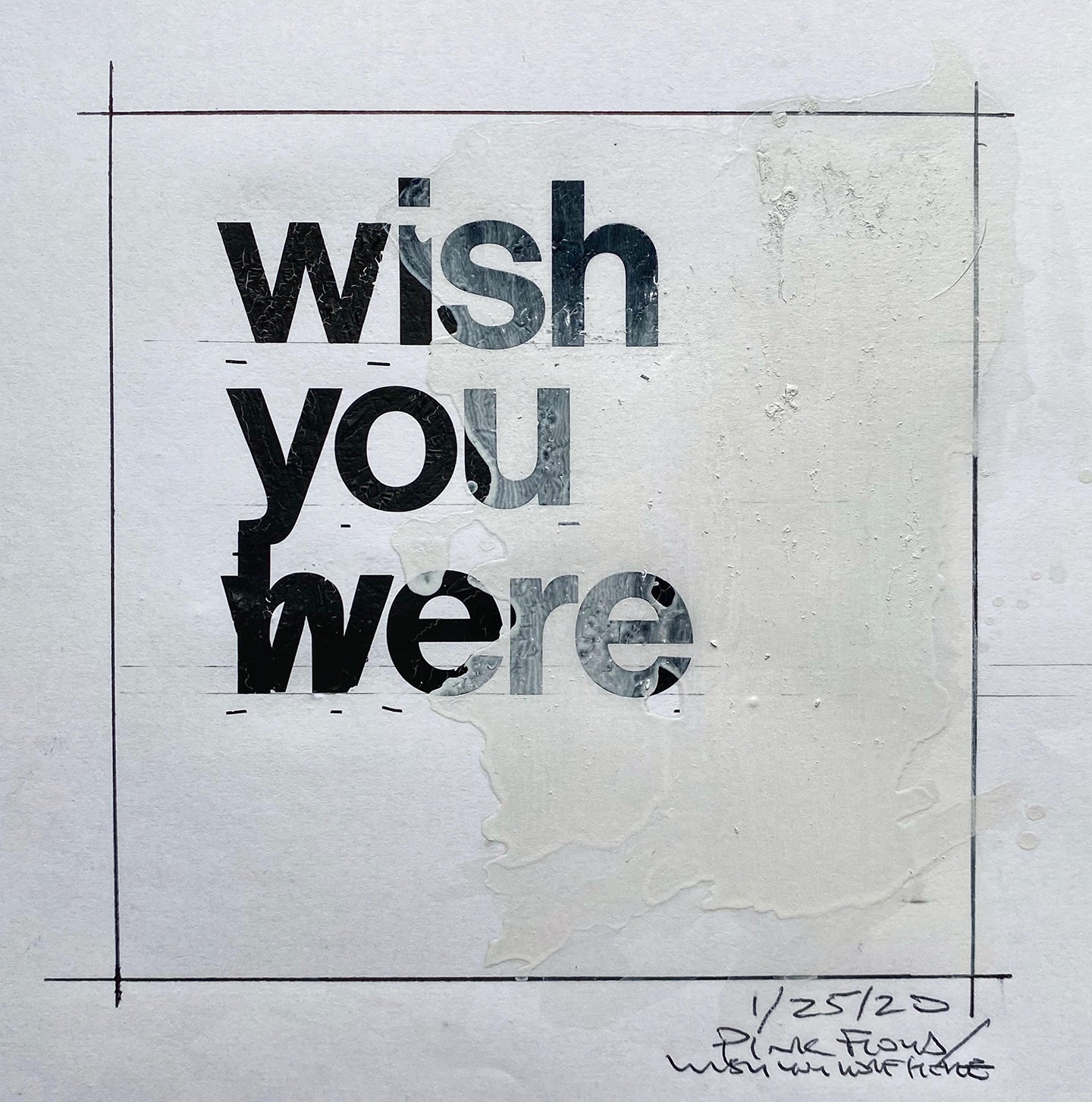 Sound in Print typographic sketch created by hand. Ingredients: Letraset, 3M Surgical Tape, Bloomberg Magazine, San Pellegríno Packaging, Wire Bag Fastener, Letratone, Biro, Technical Pencil, Ruler, Pritstick, Tippex/Liquid Paper/White-Out, Paper. Art: 5" x 5" / Sheet: 11" x 17"