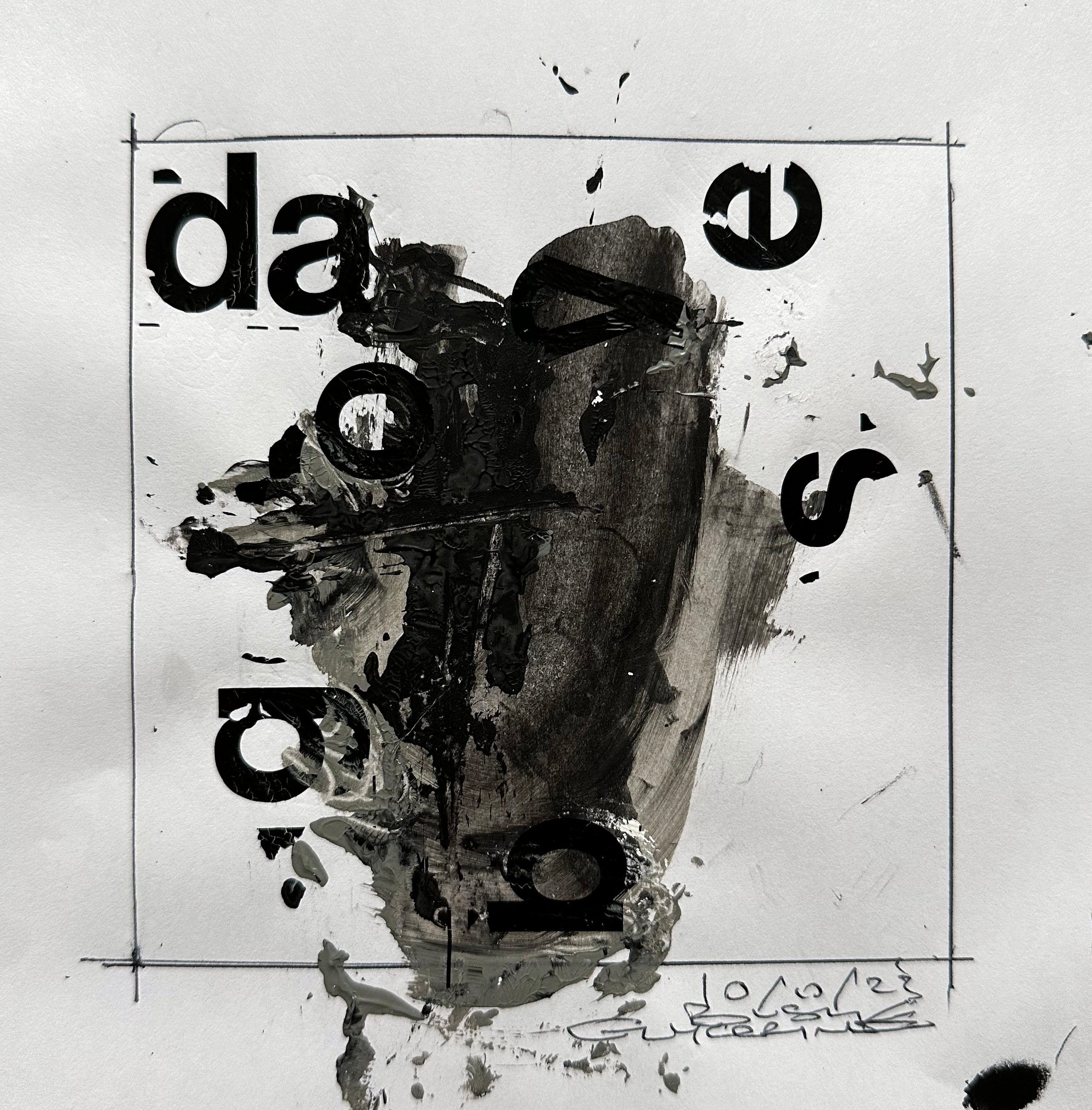 Sound in Print typographic sketch created by hand. Ingredients: Airport Luggage Labels, Letraset, Scotch Tape, Biro, Pencil, Ruler. Art: 5" x 5" / Sheet: 11" x 17"